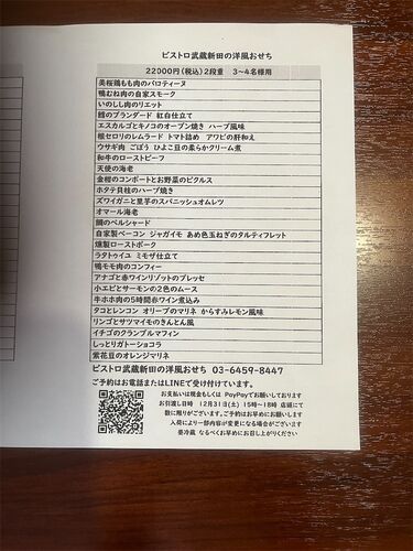 洋風おせち料理のご案内 大変お待たせいたしました。 ビストロ武蔵新田の洋風おせち料理のご案内です。 2段重22000円(税込) 3〜4名様用(要予約) お店にて、お品書きお配りしております。 SNSにも随時載せております。 *12月31日(土)1500〜1800にお引き渡し…